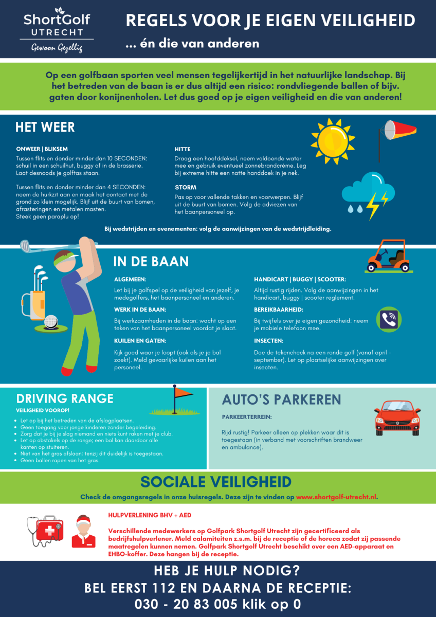 Op de poster hieronder zijn een aantal risico’s op en rond de golfbaan in kaart gebracht. Hierop wordt aangegeven hoe daar mee om te gaan. In het algemeen heeft de exploitant een zorgplicht voor een veilige omgeving waarbij de risico’s tot een aanvaardbaar niveau zijn teruggebracht.